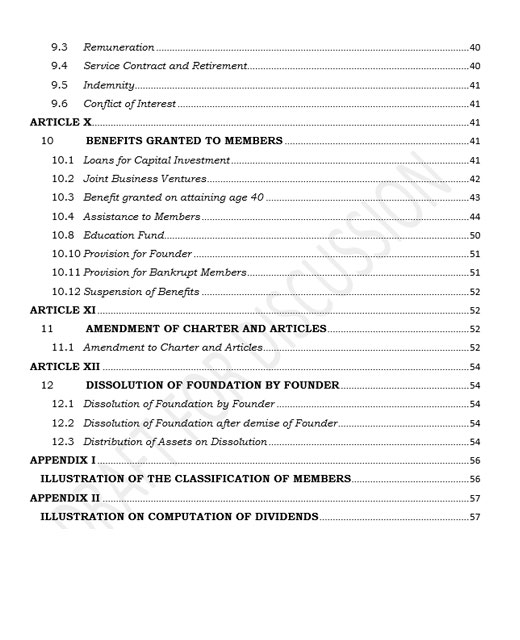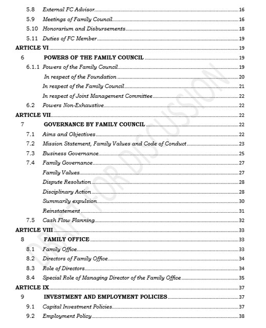 We organize one-on-one meetings of each family member in order understand the family better. After several rounds of one-on-one meetings, we then present our 1st draft for further deliberation. Upon approval, the Family Constitution will be drafted to be signed by the respective members of the family. Below is a sample of index pages and the content of clauses of a particular Family Constitution well over 60 pages.
